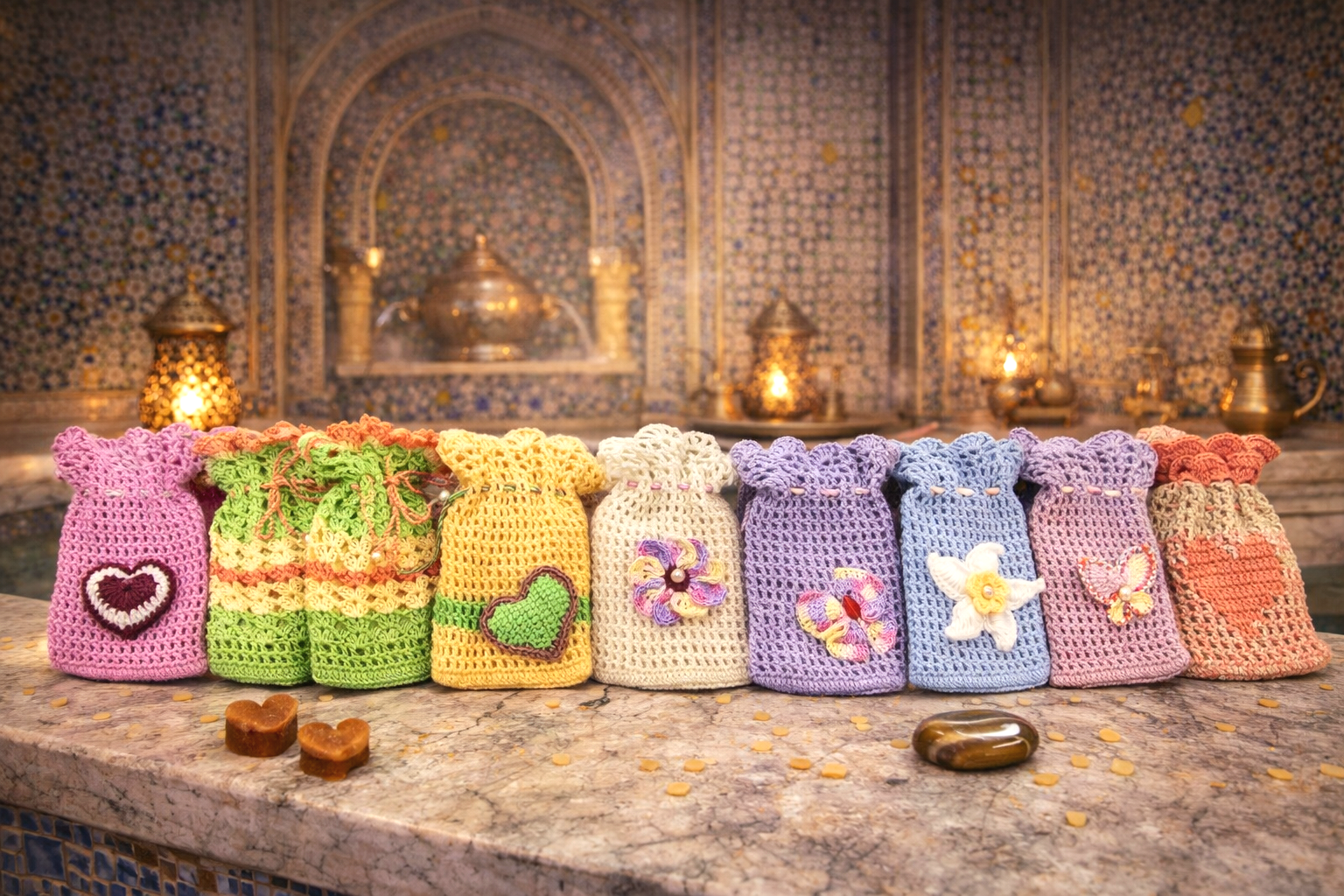 The loofahs are hand-crocheted from natural organic cotton