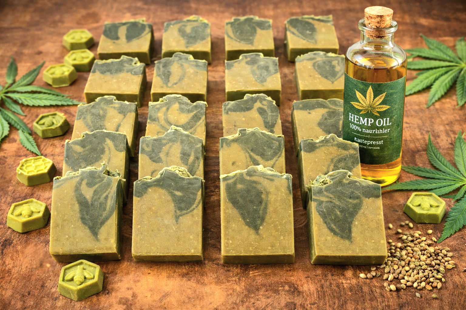 Natur Seife bestehend aus (Bio Hanföl - Argan öl - Sheabutter - Kakaobutter - Olivenöl - lein öl - Rizinusöl - Elmi ätherischesöl - teebaum öl - Spirluina Pulver
