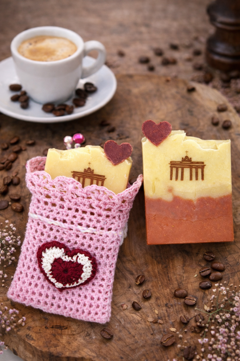 Berliner Liebesseife wird aus rein natürlichen Ölen und Farben, mit dekoriertem Herz aus Naturseifen hergestellt. Sie wird mit rosa Ton „Rose tonerde“ gefärbt und mit dem bezaubernden Gardenienduft Parfümiert.